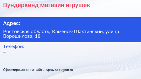 Вундеркинд, магазин игрушек по адресу Ростовская область, Каменск-Шахтинский, улица Ворошилова, 18 в дальнейшем Организация, размещена в следующих категориях: