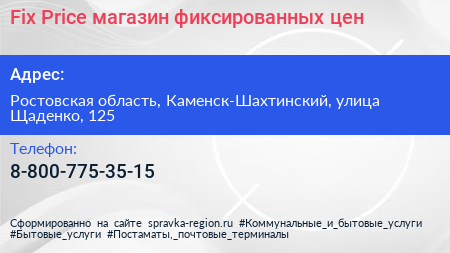 Fix Price, магазин фиксированных цен по адресу Ростовская область, Каменск-Шахтинский, улица Щаденко, 125 в дальнейшем Организация, размещена в следующих категориях: