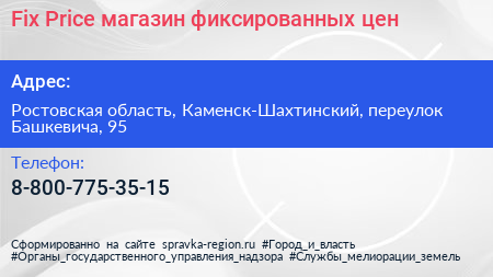 Fix Price, магазин фиксированных цен по адресу Ростовская область, Каменск-Шахтинский, переулок Башкевича, 95 в дальнейшем Организация, размещена в следующих категориях: