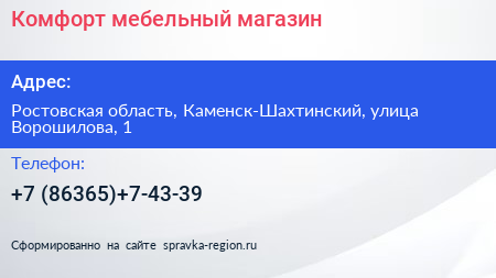 Комфорт, мебельный магазин по адресу Ростовская область, Каменск-Шахтинский, улица Ворошилова, 1 в дальнейшем Организация, размещена в следующих категориях: