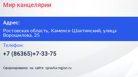 Мир канцелярии по адресу Ростовская область, Каменск-Шахтинский, улица Ворошилова, 25 в дальнейшем Организация, размещена в следующих категориях: