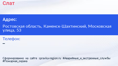 Слат по адресу Ростовская область, Каменск-Шахтинский, Московская улица, 53 в дальнейшем Организация, размещена в следующих категориях: