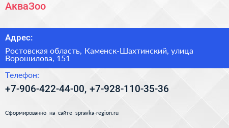 АкваЗоо по адресу Ростовская область, Каменск-Шахтинский, улица Ворошилова, 151 в дальнейшем Организация, размещена в следующих категориях: