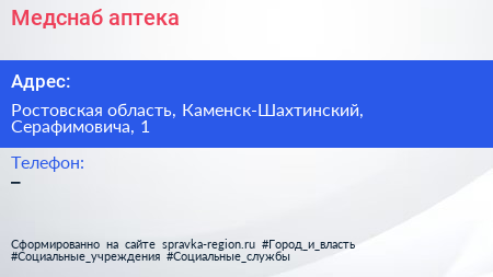 Медснаб, аптека по адресу Ростовская область, Каменск-Шахтинский, Серафимовича, 1 в дальнейшем Организация, размещена в следующих категориях: