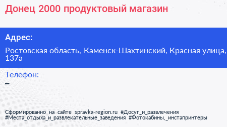 Донец-2000, продуктовый магазин по адресу Ростовская область, Каменск-Шахтинский, Красная улица, 137а в дальнейшем Организация, размещена в следующих категориях: