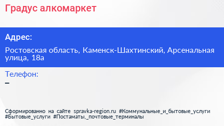 Градус, алкомаркет по адресу Ростовская область, Каменск-Шахтинский, Арсенальная улица, 18а в дальнейшем Организация, размещена в следующих категориях: