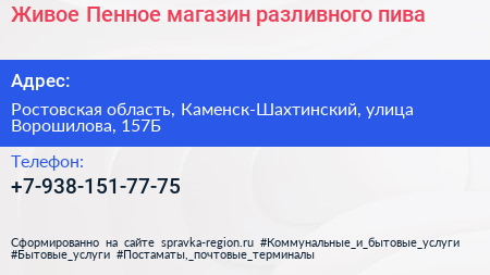 Живое Пенное, магазин разливного пива по адресу Ростовская область, Каменск-Шахтинский, улица Ворошилова, 157Б в дальнейшем Организация, размещена в следующих категориях: