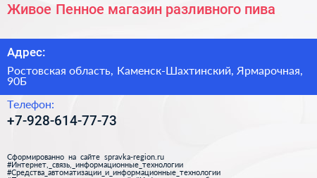 Живое Пенное, магазин разливного пива по адресу Ростовская область, Каменск-Шахтинский, Ярмарочная, 90Б в дальнейшем Организация, размещена в следующих категориях: