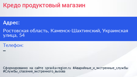 Кредо, продуктовый магазин по адресу Ростовская область, Каменск-Шахтинский, Украинская улица, 54 в дальнейшем Организация, размещена в следующих категориях: