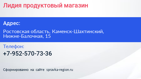 Лидия, продуктовый магазин по адресу Ростовская область, Каменск-Шахтинский, Нижне-Балочная, 15 в дальнейшем Организация, размещена в следующих категориях: