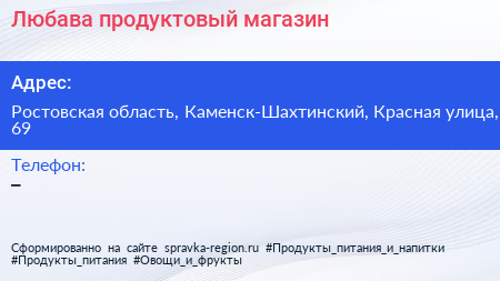 Любава, продуктовый магазин по адресу Ростовская область, Каменск-Шахтинский, Красная улица, 69 в дальнейшем Организация, размещена в следующих категориях:
