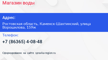 Магазин воды по адресу Ростовская область, Каменск-Шахтинский, улица Ворошилова, 159ж в дальнейшем Организация, размещена в следующих категориях: