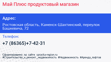 Май-Плюс, продуктовый магазин по адресу Ростовская область, Каменск-Шахтинский, переулок Башкевича, 72 в дальнейшем Организация, размещена в следующих категориях: