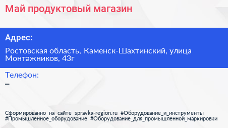 Май, продуктовый магазин по адресу Ростовская область, Каменск-Шахтинский, улица Монтажников, 43г в дальнейшем Организация, размещена в следующих категориях: