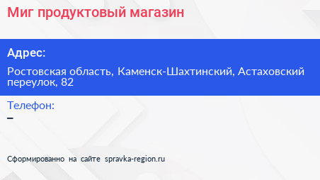 Миг, продуктовый магазин по адресу Ростовская область, Каменск-Шахтинский, Астаховский переулок, 82 в дальнейшем Организация, размещена в следующих категориях: