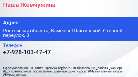 Наша Жемчужина по адресу Ростовская область, Каменск-Шахтинский, Степной переулок, 3 в дальнейшем Организация, размещена в следующих категориях:
