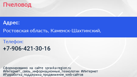 Пчеловод по адресу Ростовская область, Каменск-Шахтинский, в дальнейшем Организация, размещена в следующих категориях: