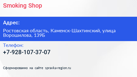 Smoking Shop по адресу Ростовская область, Каменск-Шахтинский, улица Ворошилова, 139Б в дальнейшем Организация, размещена в следующих категориях: