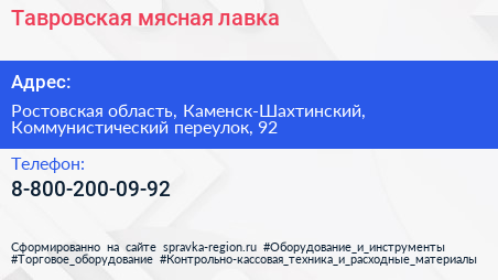 Тавровская мясная лавка по адресу Ростовская область, Каменск-Шахтинский, Коммунистический переулок, 92 в дальнейшем Организация, размещена в следующих категориях:
