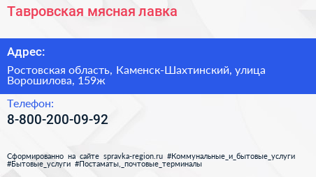 Тавровская мясная лавка по адресу Ростовская область, Каменск-Шахтинский, улица Ворошилова, 159ж в дальнейшем Организация, размещена в следующих категориях:
