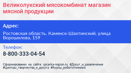 Великолукский мясокомбинат, магазин мясной продукции по адресу Ростовская область, Каменск-Шахтинский, улица Ворошилова, 159 в дальнейшем Организация, размещена в следующих категориях: