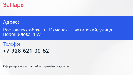 ЗаПарь! по адресу Ростовская область, Каменск-Шахтинский, улица Ворошилова, 159 в дальнейшем Организация, размещена в следующих категориях: