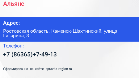 Альянс по адресу Ростовская область, Каменск-Шахтинский, улица Гагарина, 3 в дальнейшем Организация, размещена в следующих категориях: