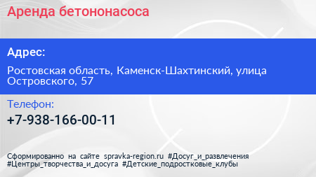 Аренда бетононасоса по адресу Ростовская область, Каменск-Шахтинский, улица Островского, 57 в дальнейшем Организация, размещена в следующих категориях: