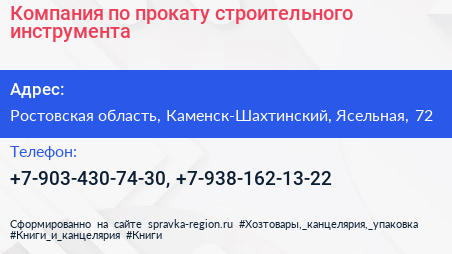 Компания по прокату строительного инструмента по адресу Ростовская область, Каменск-Шахтинский, Ясельная, 72 в дальнейшем Организация, размещена в следующих категориях: