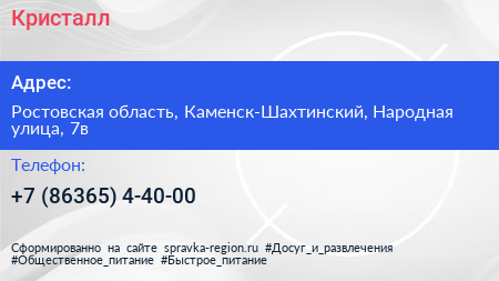 Кристалл по адресу Ростовская область, Каменск-Шахтинский, Народная улица, 7в в дальнейшем Организация, размещена в следующих категориях:
