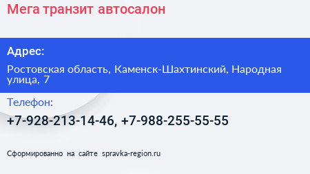 Мега-транзит, автосалон по адресу Ростовская область, Каменск-Шахтинский, Народная улица, 7 в дальнейшем Организация, размещена в следующих категориях: