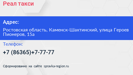 Реал, такси по адресу Ростовская область, Каменск-Шахтинский, улица Героев Пионеров, 15а в дальнейшем Организация, размещена в следующих категориях: