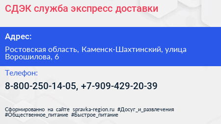 СДЭК, служба экспресс-доставки по адресу Ростовская область, Каменск-Шахтинский, улица Ворошилова, 6 в дальнейшем Организация, размещена в следующих категориях: