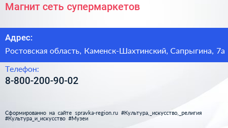 Магнит, сеть супермаркетов по адресу Ростовская область, Каменск-Шахтинский, Сапрыгина, 7а в дальнейшем Организация, размещена в следующих категориях: