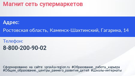 Магнит, сеть супермаркетов по адресу Ростовская область, Каменск-Шахтинский, Гагарина, 14 в дальнейшем Организация, размещена в следующих категориях: