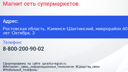 Магнит, сеть супермаркетов по адресу Ростовская область, Каменск-Шахтинский, микрорайон 60 лет Октября, 3 в дальнейшем Организация, размещена в следующих категориях: