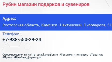 Рубин, магазин подарков и сувениров по адресу Ростовская область, Каменск-Шахтинский, Пивоварова, 51 в дальнейшем Организация, размещена в следующих категориях: