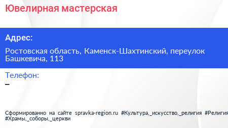 Ювелирная мастерская по адресу Ростовская область, Каменск-Шахтинский, переулок Башкевича, 113 в дальнейшем Организация, размещена в следующих категориях: