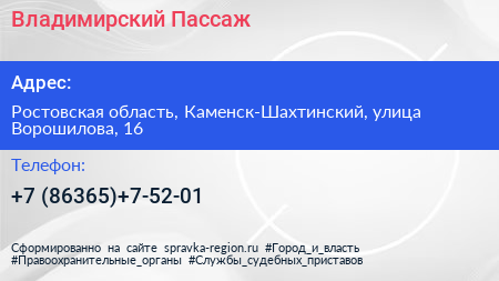 Владимирский Пассаж по адресу Ростовская область, Каменск-Шахтинский, улица Ворошилова, 16 в дальнейшем Организация, размещена в следующих категориях:
