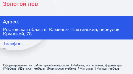 Золотой лев по адресу Ростовская область, Каменск-Шахтинский, переулок Крупской, 78 в дальнейшем Организация, размещена в следующих категориях: