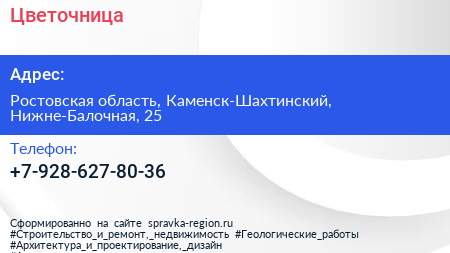 Цветочница по адресу Ростовская область, Каменск-Шахтинский, Нижне-Балочная, 25 в дальнейшем Организация, размещена в следующих категориях: