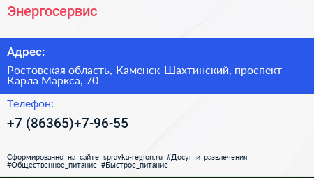 Энергосервис по адресу Ростовская область, Каменск-Шахтинский, проспект Карла Маркса, 70 в дальнейшем Организация, размещена в следующих категориях: