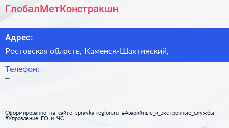 ГлобалМетКонстракшн по адресу Ростовская область, Каменск-Шахтинский, в дальнейшем Организация, размещена в следующих категориях: