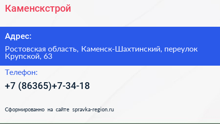 Каменскстрой по адресу Ростовская область, Каменск-Шахтинский, переулок Крупской, 63 в дальнейшем Организация, размещена в следующих категориях: