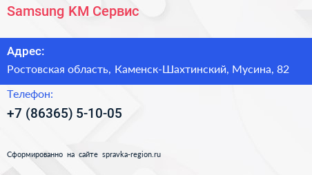 Samsung-KM Сервис по адресу Ростовская область, Каменск-Шахтинский, Мусина, 82 в дальнейшем Организация, размещена в следующих категориях: