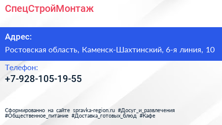 СпецСтройМонтаж по адресу Ростовская область, Каменск-Шахтинский, 6-я линия, 10 в дальнейшем Организация, размещена в следующих категориях: