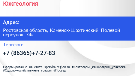 Южгеология по адресу Ростовская область, Каменск-Шахтинский, Полевой переулок, 74а в дальнейшем Организация, размещена в следующих категориях: