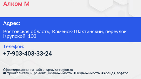 Алком-М по адресу Ростовская область, Каменск-Шахтинский, переулок Крупской, 103 в дальнейшем Организация, размещена в следующих категориях: