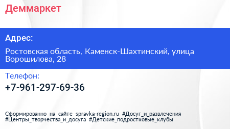 Деммаркет по адресу Ростовская область, Каменск-Шахтинский, улица Ворошилова, 28 в дальнейшем Организация, размещена в следующих категориях: