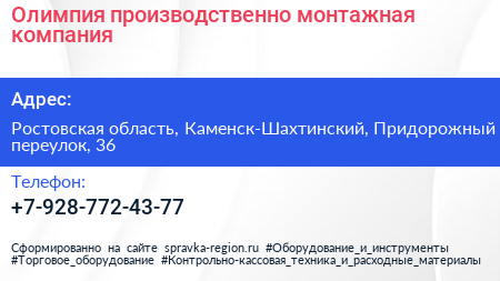 Олимпия, производственно-монтажная компания по адресу Ростовская область, Каменск-Шахтинский, Придорожный переулок, 36 в дальнейшем Организация, размещена в следующих категориях:
